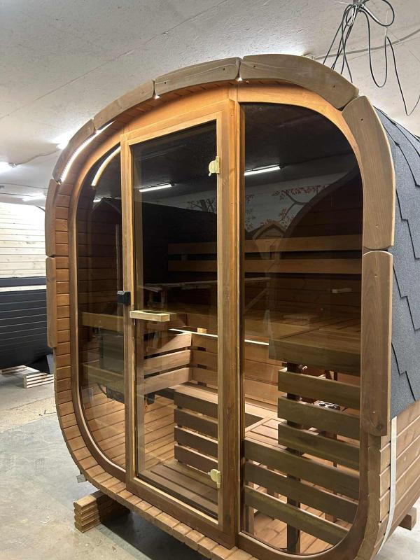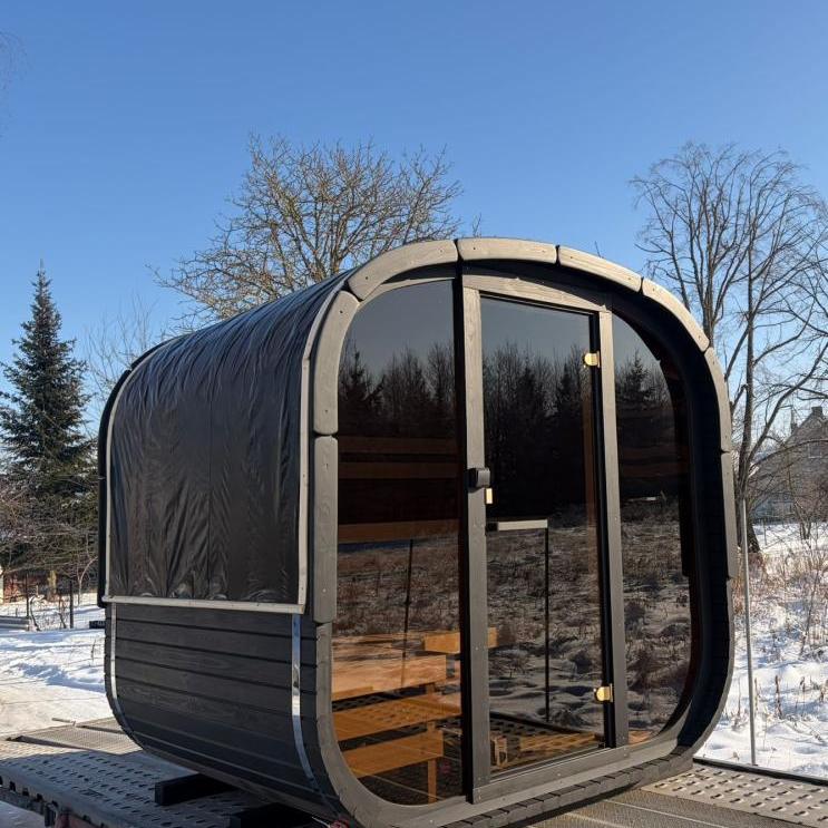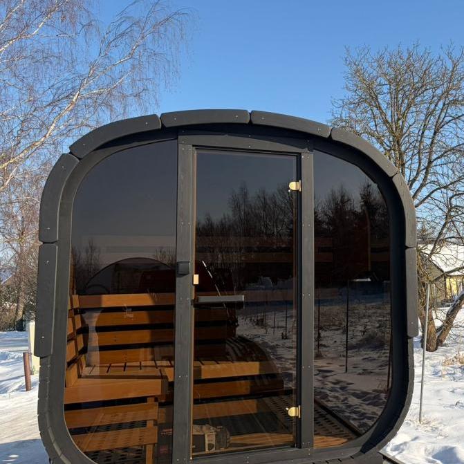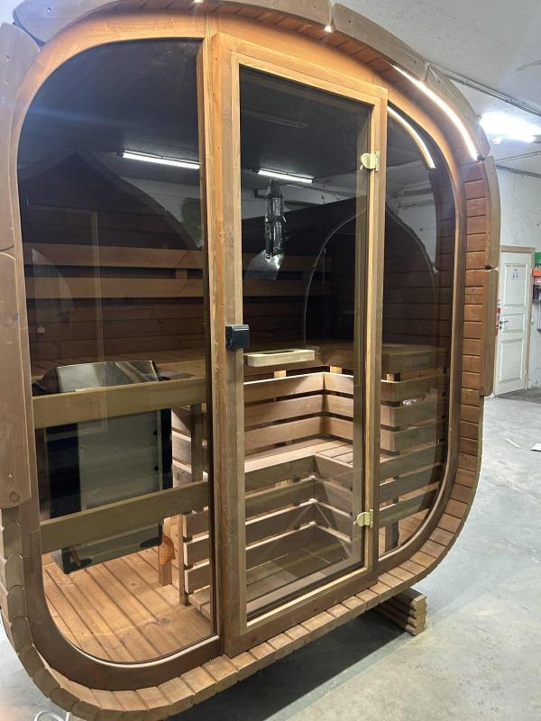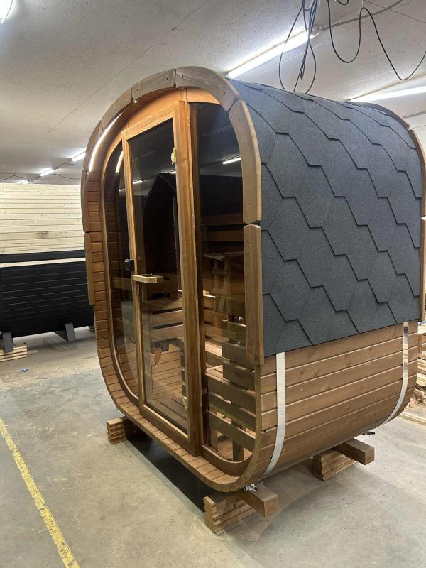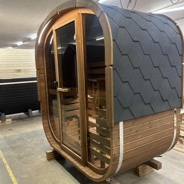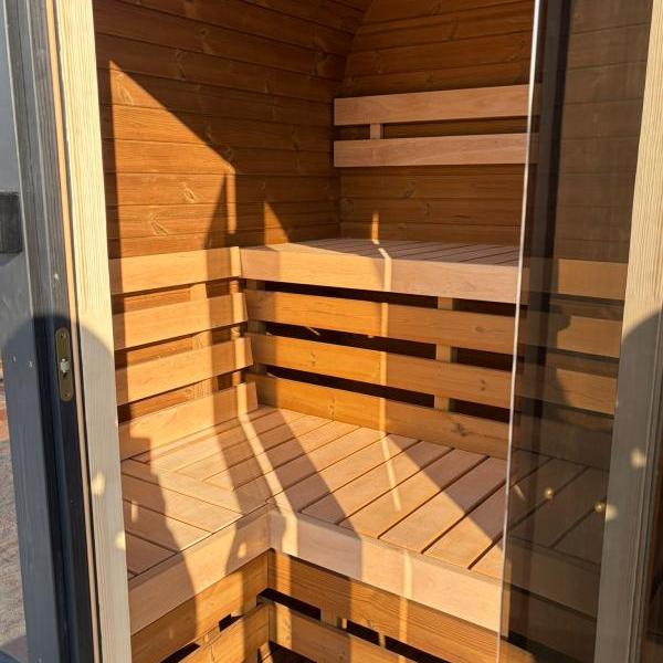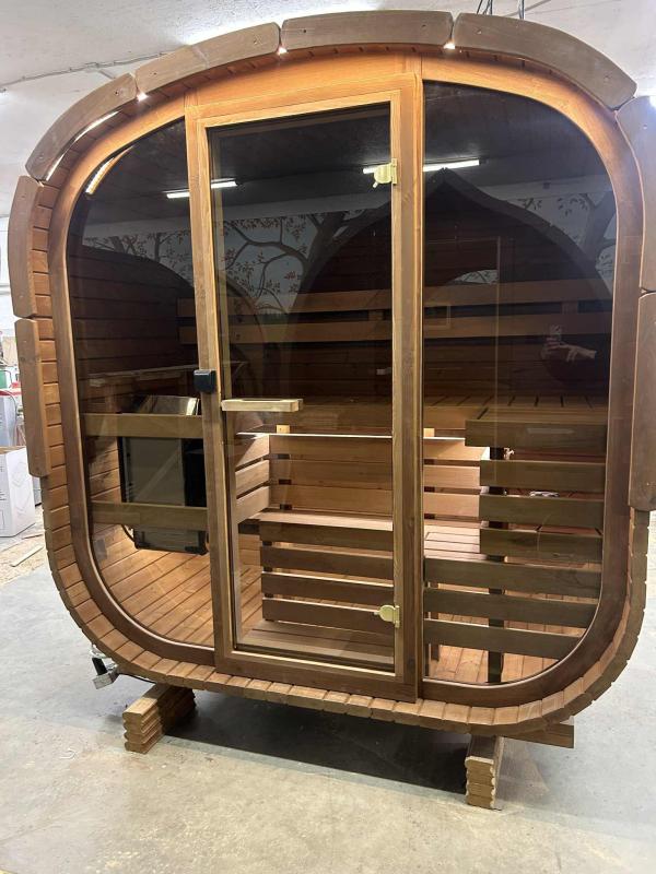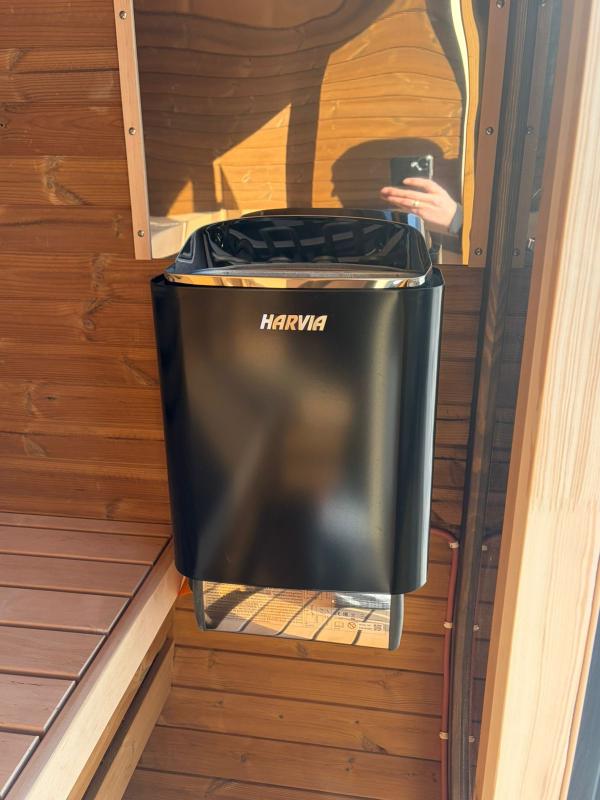 Der 6 kW elektrische Heizofen und die Frontverglasung der Sauna sind bereits im Preis der Sauna enthalten!