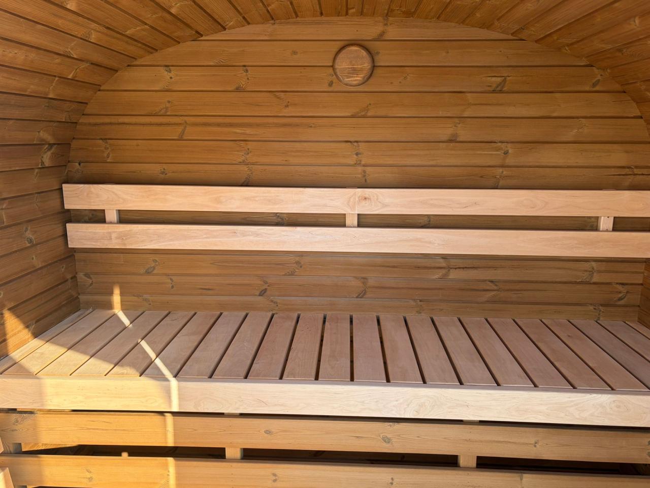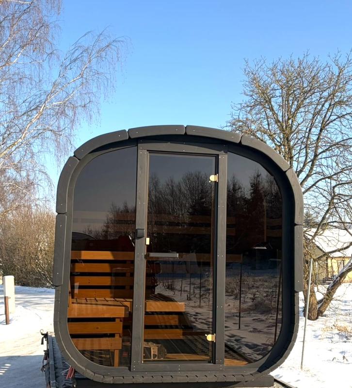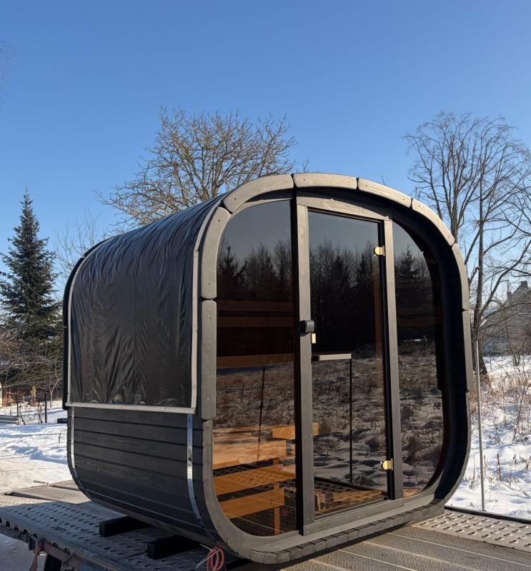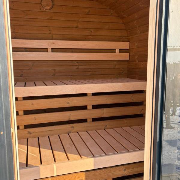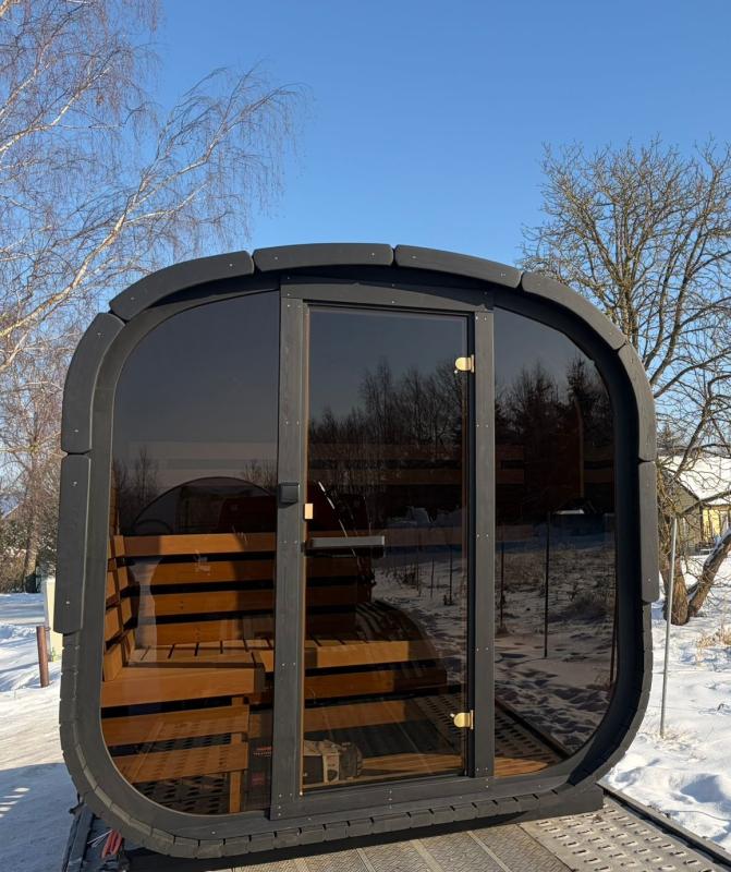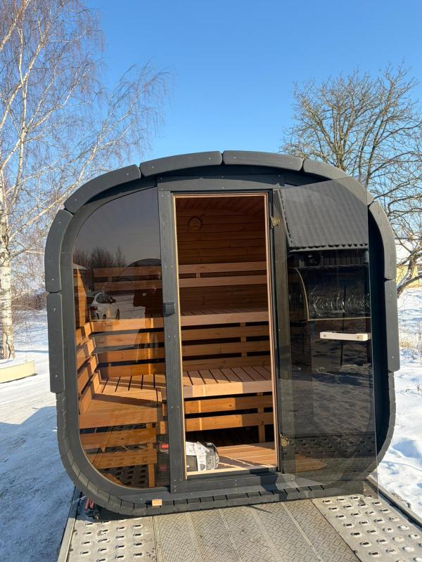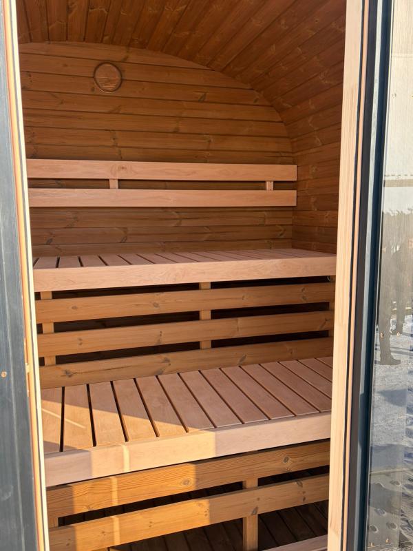 Der 6 kW elektrische Heizofen und die Frontverglasung der Sauna sind bereits im Preis der Sauna enthalten!